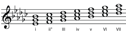 | E♭ - G♭ - B♭ | F - A♭ - C♭ | G♭ - B♭ - D♭ | A♭ - C♭ - E♭ | B♭ - D♭ - F | C♭ - E♭ - G♭ | D♭ - F - A♭ |