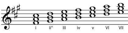 | F sharp minor | G sharp diminished | A major | B minor | C sharp minor | D major | E major |